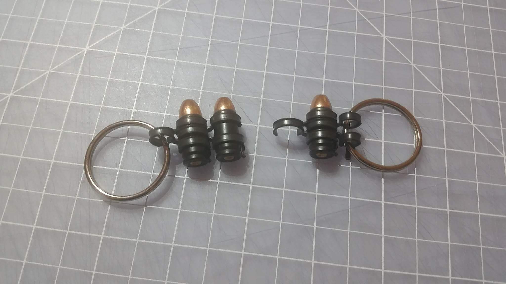 Custom handcrafted 9mm black nitride cases with 9mm DRT lead free am, linked with black nitride steel links and 2 steel key rings. You can organize your keys and remove the center bullet allowing keys to be split up! *AMMUNITION IS NOT LIVE it is loaded without powder and spent primers* Item is custom made, please allow 2-4 weeks for shipping. All international orders are shipped labeled jewelry. Buyer assumes all risk associated with customs and related fees.